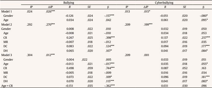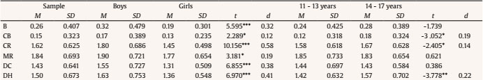 To examine potential age differences, the sample was split into two halves (11-13 and 14-17 years old). Student’s t-test showed statistically significant differences in cyberbullying, with higher scores in the older adolescents (M = 0.18 vs. 0.12), but no difference for offline bullying. Significantly higher scores for moral disengagement were found for students aged 14 to 17 in cognitive restructuring (M = 1.67 vs. 1.58) and dehumanizing (M = 1.57 vs. 1.42). The bivariate effect size was low for all the variables (see Table 1).