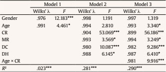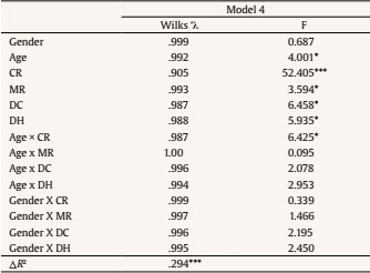 Table 3 presents results for multivariate regression of combined offline- and online-bullying perpetration. Gender and age were significantly associated with bullying in Model 1 (R2 = .023), with boys and older students reporting greater bullying. In Model 2, the separate moral disengagement strategies were added; all were significantly and independently associated with bullying (R2 = .281). With these in the model, neither gender nor age were significant predictors. Multivariate tests showed that inclusion of moral disengagement strategies in Model 2 yielded a significantly better model fit.