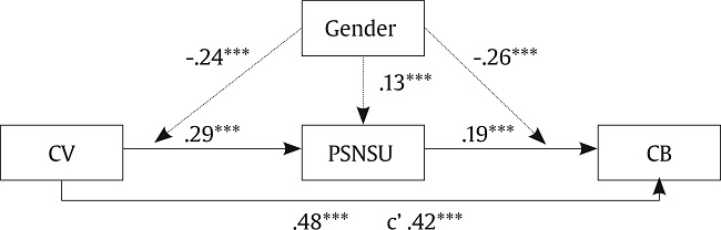 Results of the bias-corrected percentile bootstrap found that the indirect effect of cybervictimization on cyberbullying through PSNSU was not moderated by gender (effect = .03, SE = .02, 95% CI [.00, .07]).