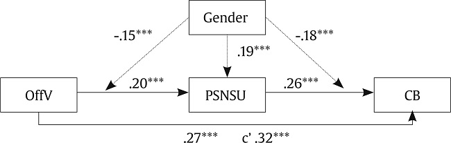 The purpose of this study was to examine the mediating role of PSNSU in the relationship between both cybervictimization and offline victimization and cyberbullying. We further explored the moderating effect of gender on these relationships. The results revealed that there is a direct and positive relationship between both cybervictimization and offline victimization, and cyberbullying, thus confirming the first hypothesis. These findings are in line with findings of other studies revealing that a significant number of students who experienced peer victimization both offline and online engage in cyberbullying as a response to this situation (Estévez et al., 2020; Walters & Espelage, 2018).