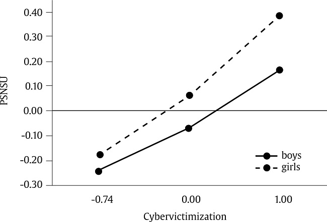With regard to the moderation effects, first we plotted predicted cyberbullying and cybervictimization separately for boys and for girls (Figure 3a) as well as predicted PSNSU and cybervictimization separately for boys and girls (Figure 3b). As presented in Figure 3a, simple slope tests indicated that for boys higher levels of cybervictimization were related to higher levels of cyberbullying than for girls (ßboys = .56, t = 19.57, p < .001, 95% CI [.50, .61], ßgirls = .32, t = 11.57, p < .001, 95% CI [.26, .37]).