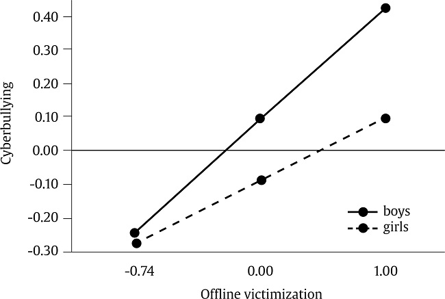With respect to the moderation effects, for descriptive purposes, we plotted predicted cyberbullying and offline peer victimization separately for boys and for girls (Figure 4a). Simple slope tests indicated that for boys higher levels of offline peer victimization were related to higher levels of cyberbullying than for girls (ßboys = .33, t = 11.75, p < .001, 95% CI [.27, .38], ßgirls = .18, t = 5.78, p < .001, 95% CI [.12, .24]).
