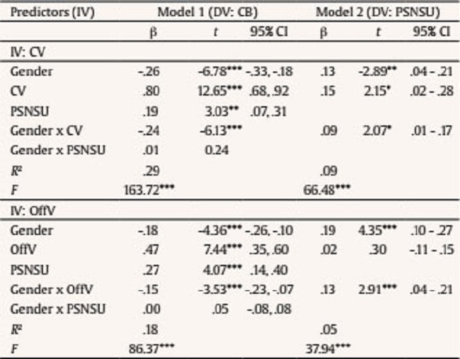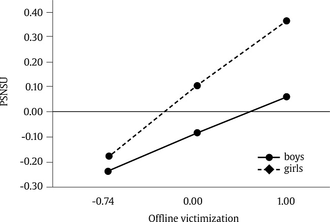 Results of Model 1 indicated that offline victimization and PSNSU were positively related to cyberbullying (ß = .47, p < .001, ß = .27, p < .01, respectively), whereas gender was negatively related to cyberbullying (ß = -.18, p < .01). A moderation effect of offline peer victimization and gender (ß = -.15, p < .001) was also found. Model 2 showed that gender was positively related to PSNSU (ß = .19, p < .01), whereas offline peer victimization was not a significant predictor of PSNSU (ß = -.02, p = .77). However, the relationship between offline peer victimization and PSNSU was moderated by gender (ß = -.13, p < .001).
