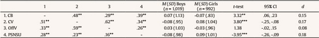 Table 1 outlines means, standard deviations, and zero-order correlations among all study variables separately for boys and girls. Findings revealed that cyberbullying, cyber victimization, offline victimization, and PSNSU were positively related for boys and girls. Next, an independent sample t-test was conducted to test differences among study variables according to gender. As shown in Table 1, boys reported higher levels in cyberbullying, whereas girls reported higher levels in cybervictimization and PSNSU.
