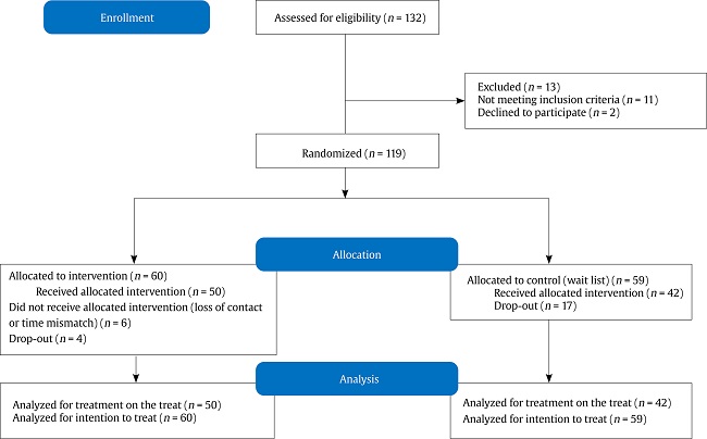 The initial sample of 132 mothers of 2 to 6-year-old children was assessed for eligibility criteria. Eleven mothers did not meet the inclusion criteria and two mothers declined to participate in the study. Then, 119 mothers were randomized into two groups (randomization in blocks of each site), allocating 60 mothers in the IG and 59 in the CG. Six mothers did not complete the intervention in the IG, and four mothers dropped out of the study, leaving 50 mothers. In the CG, in turn, 17 mothers dropped out of the study in the waiting period.