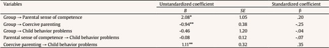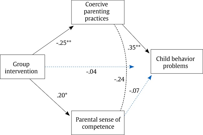 In conclusion, the present study showed that the Strengthening Bonds intervention reduced maternal negative coercive practices and child behavior problems, in this case, adjusted for socioeconomic level and mother’s years of schooling. Also, examining the mechanisms of the intervention’s effect, we detected a direct effect for improving mothers’ sense of competence and decreasing coercive parenting practices. This practice mediated the reduction of children’s behavior problems.