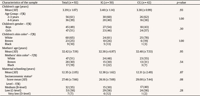Table 1 shows the main sociodemographic characteristics of the IG and CG groups. There were no statistically significant differences between the two groups for mothers’ and children’s characteristics. In both groups, children’s mean age was three years, predominantly between 2 and 3 years. In both groups, the mothers were young adults with 12 years of schooling, on average. In both groups, the children’s and mother’s racial designation was primarily white, and families’ socioeconomic level was predominantly low income.