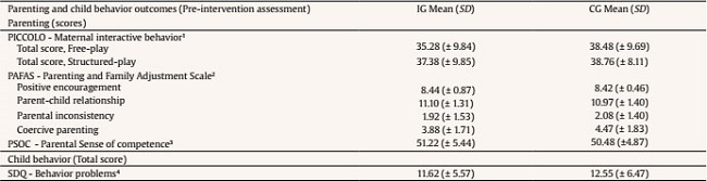 Table 2 presents the descriptive data (mean and standard deviation) of the primary outcomes (maternal interactive behavior, maternal parenting practices, and parental sense of competence) and secondary outcome (child behavior) at the baseline (pre-intervention assessment). There were no statistically significant differences between-group comparisons for all outcomes at baseline; then, both groups are similar at the beginning of the RCT study.