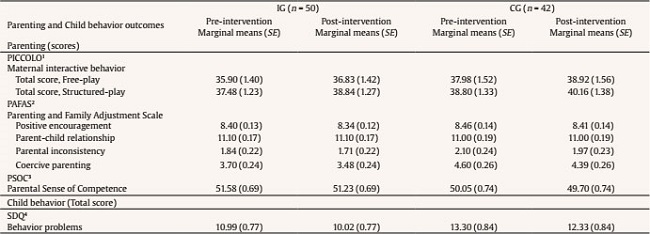 Third, Table 4 shows, in the treatment-on-the-treated GEE analysis, the marginal means and standard error of the primary outcomes (maternal interactive behavior, maternal parenting practices, and parental sense of competence) and secondary outcome (child behavior), the IG and CG in pre- and post-intervention assessments.