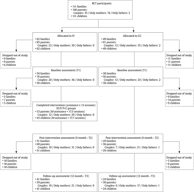 The unit of randomization was the child. It was controlled that at least one third of the children assigned to the Incredible Years group were girls. After consent, participants were blindly allocated using a computer-generated random number sequence by an independent researcher, to Incredible Years (IY; n = 62 families, 85 parents) or to the control group (CG; n = 49 families, 61 parents). Baseline (Time 1), post-intervention (Time 2; 6 month), and follow-up (Time 3; 12 month) assessments were conducted at families homes by an independent, trained evaluator. Although the evaluator should be blind to participants group membership, in many cases masking was not possible because families disclosed informative details. Between allocation and baseline assessment, 17% (n = 21) of participants dropped out the study: 9.6% (n = 6) in the IY group and 22.4% (n = 11) in the control group.