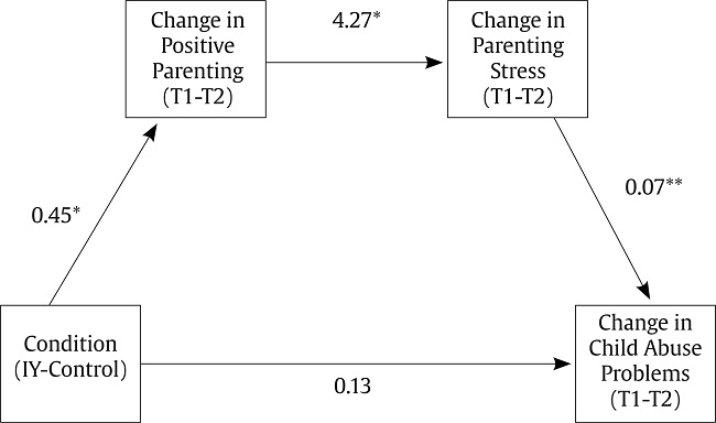 Mediational model of change in child abuse potential (BCAP). As can be seen in Figure 2, intervention had a fully mediated effect in the change of child abuse potential via changes in positive parenting and in parenting stress. The mediating effect of positive parenting was observed only when it was measured through parents self-report ( = .12, SE = .07, 95% CI [.002, .278]). When compared to the control group, parents who participated in IY reported a greater change in PPI positive parenting at post-intervention ( = .45, SE = .19, p = .019), which furthered a greater change in PSI-SF parenting stress ( = 4.27, SE = 1.71, p = .014), which in turn led to a greater change in BCAP child abuse potential ( = .06, SE = .02, p = .004).