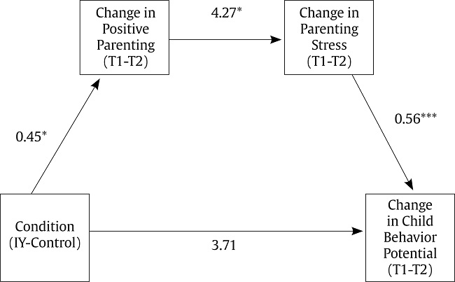 Mediational model of change in child behavior problems (ECBI). As can be seen in Figure 3, the treatment had a fully mediated effect in the change of child behavior problems via changes in positive parenting and in parenting stress. The mediating effect of positive parenting was observed only when it was measured with self-report ( = 1.08, SE = .68, 95% CI [.005, 2.56]). When compared to the control group, parents who participated in IY reported a greater change in PPI positive parenting at post-intervention ( =.45, SE = .19, p = .019), the change in positive parenting promoting greater changes in PSI-SF parenting stress ( = 4.27, SE = 1.71, p = .014), which in turn led to a greater change in ECBI child behavior problems ( = .56, SE = .14, p = .000).