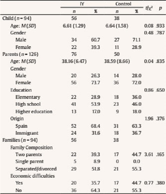 Socio-demographic characteristics of participants who completed the baseline assessment are shown in Table 1. No statistically significant differences were found between IY and control groups. Most of the children were boys (IY = 60.7%, CG = 71.1%), with a mean age of 6.61 years in the IY group (SD = 1.29) and 6.64 years in the control group (SD = 1.58). Most of the participants were mothers (IY = 73.7%, CG = 72.0%), although there were a significant percentage of fathers (IY = 26.3%, CG = 28.0%). Approximately one third of the parents (IY = 28.9%, CG = 36.0%) had only primary education. There were high percentages of immigrant parents (IY = 31.6%, CG = 36.7%), single-parent or separated/divorced families (IY = 60.7%, CG = 55.3%), and families with economic difficulties (IY = 35.7%, CG = 44.7%) in both groups. Most of the families (IY n = 33, 58.9%; CG n = 26, 68.4%) had at least one substantiated child maltreatment report, while the remaining families were at-risk (IY n = 23, 41.1%; CG n = 12, 31.6%).