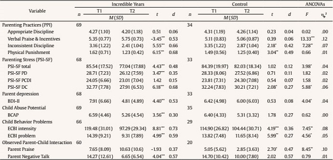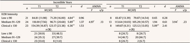To evaluate differences between IY and control groups in Time 1 (baseline), Time 2 (post-intervention, 6 month), and Time 3 (follow-up, 12 month) assessments, univariate and multivariate analysis of covariance (ANCOVAs) were used, including previous Time scores as covariates. Effect sizes (ES) were calculated with partial eta square (p2) and classified according to Cohens principles: .01 for a small effect, .06 for a medium effect, and .14 for a large effect size. Paired samples t-test were also calculated between Time1-Time2, Time2-Time3, and Time1-Time3 assessments for each group. Cohens d was used to calculate effect sizes, d 0.20 was considered a small effect, d 0.50 a medium effect, and d 0.80 a large effect. These analyses were also used to analyze post-intervention intragroup differences based on severity of child behavior problems (low, medium, and clinical range) and on IY attendance (less or more than 13 sessions).