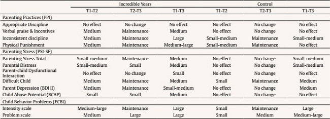 Our results showed that, when IY and control groups were compared, the IY-Parent plus IY-Child interventions made a significant positive difference from baseline to T2 in parents reported and observed use of positive parenting practices such as praise, accompanied by a significant reduction of reported inconsistent discipline, parenting stress, parental depressive symptomatology, and perception of child behavior problems. No significant differences between the IY and the control groups were found in parents reports of appropriate discipline, physical punishment, child abuse potential, and observed negative talk.