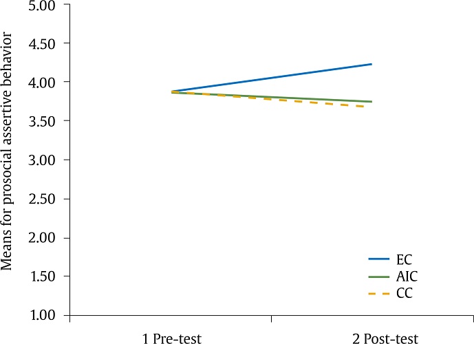 Pre and post-test differences in prosocial assertive behavior among groups. We computed an analysis of covariance (ANCOVA) for repeated measures from the pre- and post-test survey data on prosocial assertive behavior of the EC, AIC, and CC because of existing pre-test differences with IBM, SPSS, 25.0. All statistical assumptions were met. The data used in this analysis was from participants who participated in both the pre and post-tests (EC = 103, AIC = 37, CC = 54). Participants who did not attend the sessions were not included in this analysis. We also present the effect size according to Cohen’s (1988) cut-off points for small (hp2 = .009), medium (hp2 = .058) and large effects (hp2 = .137).