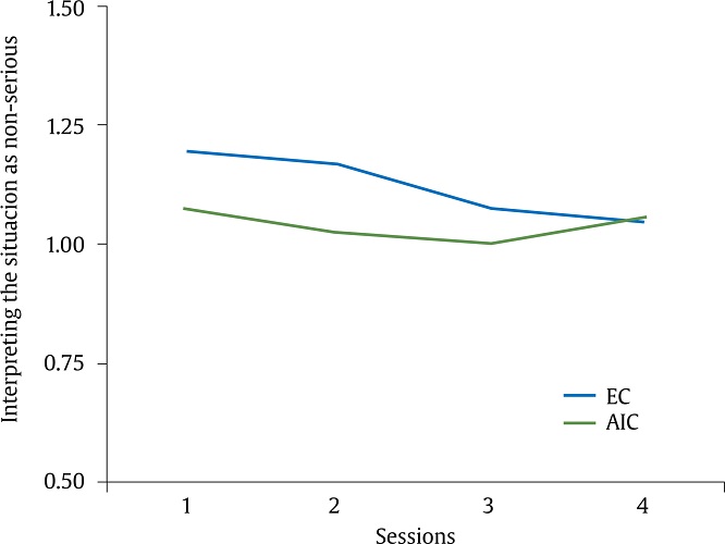 After performing multilevel analyses, the estimates of variance for levels 1 and 2 of interpreting the cyberbullying situation as non-serious (repeated measures: Zw = 7.54, Zw = 7.20, Zw = 6.35, Zw = 6.60, p < .001; intercept: Zw = 3.18, p < .001, respectively) suggest that there was sufficient variation in intercepts across bystanders. Results revealed a variance between individuals of 8% (session 1), 11% (session 2), 22% (session 3), and 22% (session 4) for a diagonal structure of interpreting the cyberbullying situation as non-serious and 92% (session 1), 89% (session 2), 78% (session 3), and 78% (session 4) of variance within individuals for interpreting the cyberbullying situation as non-serious over time. For interpreting the cyberbullying situation as non-serious, models 2 and 3 presented improved fit indices over model 1 (deviance = 4.49, df = 1, p < .01; deviance = 2.69, df = 3, p < .01, respectively), although model 3 did not present better fit values than model 2. The results pertaining to the fixed effects for interpreting cyberbullying as non-serious suggest that the scores of the participants in the AIC did not increase significantly over each interval. Results also suggest that there was an initial significant difference between this group and those in the EC. However, over time, players (i.e., EC) decreased their interpretation of cyberbullying as non-serious at a greater rate (β = -.05) than those in the AIC (Figure 3). These results confirm Hypothesis 2, which stated that those who did not experience the game tended to interpret the cyberbullying situations more as non-serious throughout time than the players.