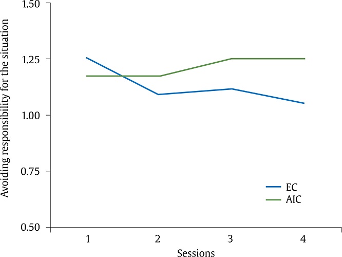 Levels 1 and 2 estimates of variance for avoiding responsibility (repeated measures: Zw = 13.83, p < .001; intercept: Zw = 3.83, p < .001, respectively) revealed that there was sufficient variation in intercepts across bystanders. Results showed a variance between individuals of 19% for a scaled identity structure of avoiding responsibility and 81% of variance within individuals for avoiding responsibility over time. For avoiding responsibility, model 3 presented improved fit indices over models 1 and 2 (deviance = 3.06, df = 3, p < .01; deviance = 4.32, df = 2, p < .01, respectively), although model 2 did not reveal better values than model 1. The results for the fixed effects regarding avoiding responsibility indicate that those in the AIC increased significantly over each interval (β = .21). Results also indicate that there was no initial significant difference between the control condition and the EC. However, over time, those in the EC decreased avoiding responsibility in cyberbullying (β = -.09), thus, confirming Hypothesis 3, which stated that those who did not experience the game would tend to avoid assuming responsibility for intervening more throughout time than the players (Figure 4).