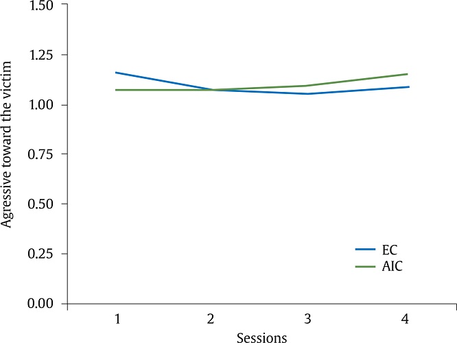 Results also indicated (Table 1) that the players (EC) were more aggressive toward the victims in sessions 0 (M = 1.16, SD = 0.36) and 3 (M = 1.09, SD = 0.28), who were from the out-group. Moreover, results also revealed that those in the AIC were more aggressive to the victim in session 3 (M = 1.15, SD = 0.36) who belonged to the out-group, and then the victim in session 2 (M = 1.10, SD = 0.30) who belonged to the in-group. These results corroborate in part Hypothesis 6, which stated that both players and those who did not experience the game would tend to be more aggressive with the victims from their out-group. Specifically, only the players in the EC fully substantiated this hypothesis, whereas those in the AIC upheld it in part.