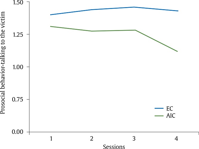 Levels 1 and 2 estimates of variance for engaging in prosocial behavior/supporting the victim (repeated measures: Zw = 6.76, Zw = 6.92, Zw = 6.64, Zw = 6.72, p < .001; intercept: Zw = 4.41 p < .001, respectively) demonstrated that there was sufficient variation in intercepts across bystanders. Results presented a variance between individuals of 27% (session 1), 26% (session 2), 28% (session 3), and 27% (session 4) for a diagonal structure of engaging in prosocial behavior/supporting the victim, and 73% (session 1), 74% (session 2), 72% (session 3), and 73% (session 4) of variance within individuals for prosocial behavior/supporting the victim over time. For engaging in prosocial behavior/supporting the victim, model 2 showed an improvement over model 1 (deviance = 0.43, df = 1, p < .01), whereas model 3 revealed better values then models 1 and 2 (deviance = 13.61, df = 3, p < .01; deviance = 13.17, df = 2, p < .01, respectively). The results for the fixed effects of engaging in prosocial behavior toward the victim showed that over each interval, the scores of those in the AIC decreased significantly (β = -.19). Results also showed that there was no initial significant difference between this group and those in the EC. Nonetheless, over time, players (i.e., EC) increased their prosocial behavior in cyberbullying situations at a greater rate (β = .07) than those in the AIC (Figure 6). These results confirm Hypothesis 5, which stated that players would tend to support the victim more throughout time than those who did not experience the game.