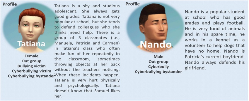 The game starts with a storyline in an immersive school context where social agents are depicted as peers with different profiles, a profile picture, and a background story to increase players’ engagement and interaction. Some of the social agents’ characteristics potentially resemble some of the players so they can identify more easily with them. A total of twelve social agents are presented in the storyline, five of which belong to the players’ in-group of friends to create proximity, while the remaining agents belong to the out-group.