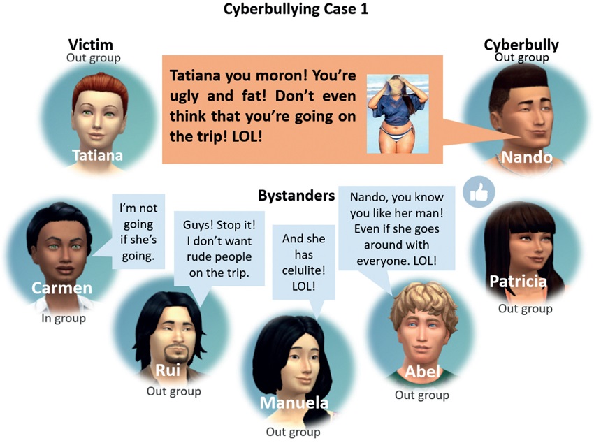 With an increasing adherence to social networks, adolescents often witness aggressive behavior online among peers and may react in different ways as bystanders of these events (Ferreira et al., 2020). How adolescents behave when witnessing cyberbullying incidents may be influenced by personal, behavioral, and contextual aspects (DeSmet et al., 2016). Throughout this decision-making process while interacting with others, personal, behavioral, and contextual factors influence each other at varying levels and in different types of interaction (Bandura, 2006). Cyberbullying may be defined as repeated and intentionally harmful actions toward peers using digital technologies (Hinduja & Patchin, 2009) and often occurs without being captured in real-time. Context is critical to help understand and deal with the phenomenon. Serious games with social (non-human) agents offer promising prospects to provide context to understand adolescent bystanders’ reactions to cyberbullying. A game may be defined as a system which consists of individuals who engage in the activity of playing, the rules by which the activity is governed and the artefacts that are used in the activity (Martinho et al., 2014). Serious games may be considered applications (if digital) with an entertainment component that include different media to enhance players’ experience through interaction in diverse contexts while conveying a message to players, with an educational purpose to foster learning (Laamarti et al., 2014). Social agents may be considered cognitive and evolving artificial intelligence entities that can reason about their own and others’ actions, interact with other agents (Foo et al., 2007) and humans (van der Wal, 2012). As recent literature has suggested, social agents are becoming an increasingly significant part of individuals’ lives in daily work and leisure activities (Pilarski et al., 2019). Hence, how these agents can trigger individuals’ reactions and aid them in managing daily challenges, such as cyberbullying, is of utmost importance.