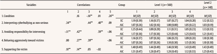 We computed multilevel linear modelling (IBM, SPSS, 25.0) for repeated measures designs in order to measure the difference between the EC and the AIC regarding their bystander behavior throughout the four sessions. Data was structured at the within-person in time level (level 1) and the between person level (level 2). We used a sample size of 560 session entries (4 session entries per participant measured on four occasions) for participants’ bystander behavior at level 1, and of 140 participants at level 2. At level 1 of the analyses, the variance corresponds to the variability in the bystanders’ average of interpreting the cyberbullying situation as non-serious (Hypothesis 2), avoiding responsibility (Hypothesis 3), engaging in aggressive behavior toward the victim (Hypothesis 4), and engaging in prosocial behavior/supporting the victim (Hhypothesis 5) around their own growth trajectory (Singer et al., 2003).