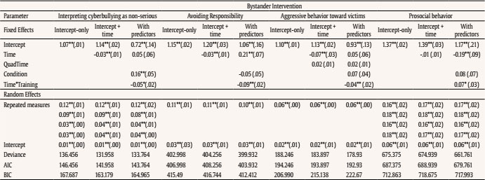 A linear time variable was significant in explaining the growth of interpreting the cyberbullying situation as non-serious, avoiding responsibility and engaging in prosocial behavior/supporting the victim, whereas linear and quadratic time were significant in explaining the growth of engaging in aggressive behavior toward the victim (Table 2).