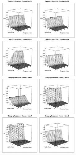 To further inspect the properties of the items and their information, an item response (IRT) model was fitted. Considering the continuous nature of the data, the continuous response model was applied to the first sample (Samejima, 1973), estimated using maximum-likelihood with the expectation-maximization algorithm (Zopluoglu, 2012, 2013). This model allows us to identify which levels of the latent trait continuum (i.e., perceived severity) are better assessed by each item.