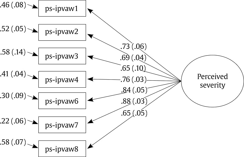 The second sample was used to replicate the one-factor solution in a different independent sample. The one-factor model showed an excellent fit (CFI = .96, TLI = .94, RMSEA 90% CI = .055 [.036, .075], SRMR = .032). All loadings were above .60, supporting a strong relationship between each item and the factor of perceived severity (Figure 2).