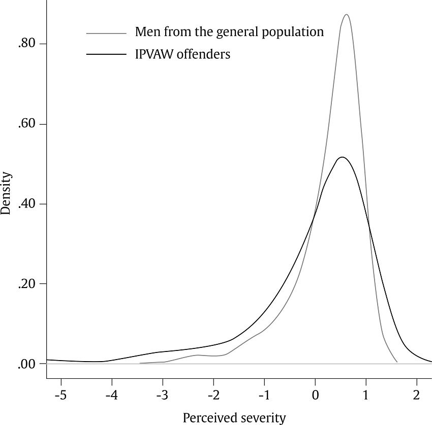 The latent means of both groups were thereafter freely estimated. The resulting model showed an acceptable fit (CFI = .94, TLI = .93, RMSEA [90% CI] = .064 [.045, .080], SRMR = .070), and we found that male participants from the general population presented a higher latent mean in the factor (i.e., perceived severity) than IPVAW offenders, Z = 0.456, SE = 0.109, p = .007. The density distributions of the factor scores in the PS-IPVAW of both groups are displayed in Figure 3. Although the distributions of both groups were centered around moderate levels of perceived severity, the factor scores of the male participants from the general sample presented a leptokurtic form, indicating that most of the participants were around moderate levels of perceived severity. The IPVAW offenders, on the other hand, were more scattered between low and moderate levels of perceived severity, presenting a higher density for negative factor scores on the scale, which in turn suggests that IPVAW offenders are more likely to be found among participants with low levels of perceived severity than men from the general sample.