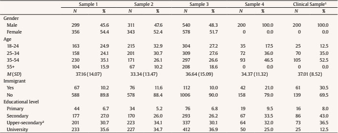 A total of 2,627 participants were recruited for the present study through online sampling using social media and e-mail snowballing, an effective and cost-efficient sampling method (Thornton et al., 2016; Topolovec-Vranic & Natarajan, 2016). Participants provided their informed consent to take part in the study before accessing and completing an online form. Participation was anonymous and voluntary. Two inclusion criteria were used: being adult and responding to all the questions and items in the online form. Participants were randomly split into four sample groups with a similar proportion of respondents of the same gender, age, educational level, and nationality. In addition, a clinical sample consisting of 200 male IPVAW offenders court-mandated to a community-based intervention program was also recruited. The sociodemographic characteristics of the samples are shown in Table 1.