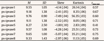 The first sample was used to conduct the descriptive analysis of the PS-IPVAW scale. The descriptive statistics of the items showed that most of the participants rated the severity of the scenarios highly, with mean values around 9 and standard deviations around 1.30. The skew and kurtosis statistics also showed this tendency as all items presented negatively skewed and leptokurtic response distributions, showing that most of the participants ratings were in the upper values of the response scale. The corrected item-test correlations were above .40 for all items, indicating a strong relationship between each item and the rest of the scale (Table 2).