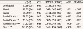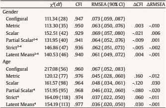 To assess the fit of the measurement invariance models, we obtained the changes in CFI (CFI) and RMSEA (RMSEA) indices. We followed the usual guidelines proposed for measurement invariance testing (Milfont & Fischer, 2010; Putnick & Bornstein, 2016), considering that there were no differences between two invariance models if CFI |.010| and RMSEA |.015| (Chen, 2007; Cheung & Rensvold, 2002). If at least scalar invariance holds across groups, then participants responses can be compared across gender or age groups through a latent means analysis.