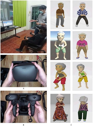In Figure 1A participants in the experimental group wore HMD, sat 100 cm in front of the computer screen, and were supervised by well-trained research assistants, Figure 1B presents wireless joystick controllers, and in Figure 1C eight elderly VR-characters with four men and women appear.