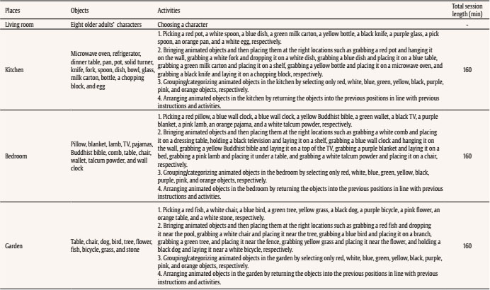 Before starting the intervention, participants were allowed to select a character out of eight models (see Figure 1C). VR scenarios (places, sounds, and objects) were designed (see Figure 2) according to the findings of a focus group with five older adults. Table 1 reports the places, objects, activities, and total session lengths of the VR experiences. The motion sickness was assessed for all participants by using an interview questionnaire. Two older adults (6.67%) reported mild motion sickness during the first session; thus, a short break was allowed to alleviate their symptoms. The experimental group received the VR training in the form of two 60 min sessions on a weekly basis for 4 weeks. After 4 weeks of training, the computer-based tests of EFs were used to assess the participants in both the control and experimental groups, and the posttest scores were compared with the pretest score.