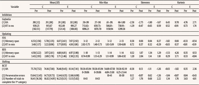 Table 2 indicates mean, SD, min-max, and skewness and the kurtosis values for the control and experimental groups across several parameters of EF tests. The normality assumption was tested to obtain accurate results for multivariate analysis. Specifically, the pretest scores for parameters of the Go/noGo, FDS/BDS, and BCST revealed a normal distribution as indexed by the skewness and kurtosis values (Brown, 2006). The skewness values ranged from 0.12 to -2.58 and the kurtosis values ranged from -0.01 to 6.43. The posttest scores for parameters of the same tests indicated the normal distribution. The skewness and kurtosis values were not greater than -3 - 3 and -10 - 10, respectively (i.e., -0.07 - 2.75 and ± 0.04 - 9.70) (Brown, 2006).