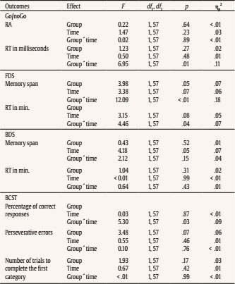 Although the pretest and posttest of the BDS test indicated a downward trend for memory span, F(1, 57) = 4.18, p = .05, ηp2 = .07, the main and interaction effects were not evident for two parameters of the BDS test, Groupmemory span: F(1, 57) = 0.43, p = .52, ηp2 = .01; Group x Timememory span: F(1, 57) = 2.12, p = .15, ηp2 = .04; GroupRT: F(1, 57) = 1.04, p = .31, ηp2 = .02; TimeRT: F(1, 57) = < .01, p = .99, ηp2 = < .01; Group x TimeRT: F(1, 57) = 0.64, p = .43, ηp2 = .01.