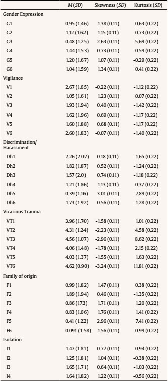 Confirmatory factor analyses supported the six-factor structure, one for each minority stress dimension from the DHEQ (i.e., gender expression related harassment, vigilance, discrimination/harassment, vicarious trauma, rejection by the family of origin and isolation; Balsam et. al., 2013; see Table 1 for the Spanish items of the DHEQ). CFA showed an acceptable level of goodness-of-fit indices (CFI = .912, TLI = .904, RMSEA = .064 [.061, .068]), and all items had indices over the acceptable range (factor loading < .60, R2 < .30; Hooper et al., 2008; Table 1). The reliability for each dimension was tested through the Cronbachs alpha and omega coefficients, and findings demonstrated a good internal consistency for each subscale (i.e., gender expression related harassment: = .77, 95% CI [.76, .81], = .79; vigilance: = .86, 95% CI [.84, .88], = .86; discrimination/harassment: = .83, 95% CI [.81, .86], = .85; vicarious trauma: = .83, 95% CI [.81, .85], = .84; rejection by family of origin: = .80, 95% CI [.77, .83], = .81; and isolation: = .79, 95% CI [.75, .81], = .80). Omega total for the scale was u = .91. Table 2 shows the descriptive statistics for the DHEQ items.