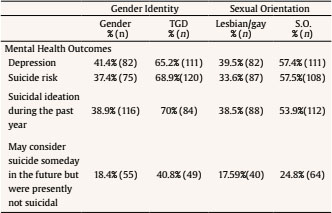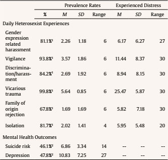 Special attention should be paid to the prior documented relation between heterosexist experiences and mental health problems (e.g., depression, suicidal ideation; Kittiteerasack et al., 2021; Meyer et al., 2021; Pachankis et al., 2019; Talley & Bettencourt, 2011), as well as how belonging to diverse social oppressed statuses could increase the risk of exposure to minority stressors. For instance, bisexual men and women have been proven to be at a greater risk of proximal stressors, such as isolation, while gay men and lesbian women are at a greater risk of exposure to distal minority stressors, such as discrimination and rejection (Mereish et al., 2017). Moreover, higher levels of discrimination and distress have been found in transgender and gender diverse individuals (TGD) when compared with cisgender LGB and heterosexual individuals (Kattari et al., 2020; Su et al., 2016; Valentine & Shipherd, 2018; Wiepjes et al., 2020). Additionally, lower levels of discrimination and victimization seem to be common among urban LGBTQ+ individuals when compared to those from suburban and rural backgrounds (Morandini et al., 2015; Shramko et al., 2018). Acknowledging these differences in prevalence rates, understanding the role of multiple marginalization, and related experiences of distress could potentially help in the implementation of a more informed clinical interventions and social justice and advocacy programs to address this pervasive problem.