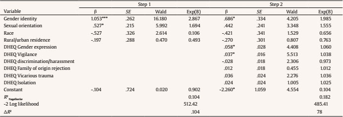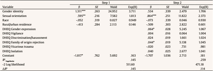 The models examining the cumulative effect of the six types of daily heterosexist experiences on symptoms of depression and suicidal behavior after controlling for covariates (i.e., gender identity, sexual orientation, race, and rural/urban residence) were significant. When analyzing the risk of depression as an outcome, results showed that identifying as a TGD individual, having a minority sexual orientation (bisexual, asexual, pansexual, or identities other than gay or lesbian; step 1), and higher scores on heterosexism related to their gender expression and vigilance (step 2) increased the risk for depression (Table 6). Furthermore, when analyzing the risk for suicidal behavior (Table 7), results showed that identifying as a TGD individual, having a minority sexual orientation (bisexual, asexual, pansexual, or identities other than gay or lesbian; step 1), and higher scores on heterosexism related to their gender expression, and rejection from the family of origin (step 2) increased suicidal risk.