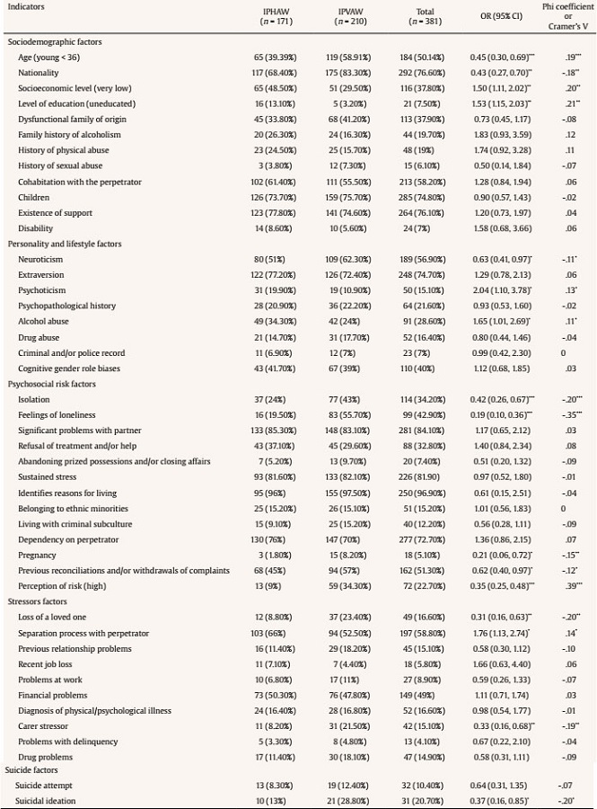 First, to obtain a detailed description of the characteristics of the sample and to find the main differences between victims of IPHAW and victims of IPVAW (H1), descriptive statistics were calculated using contingency tables. For this purpose, the different sample sizes (and their percentages) in both samples were found for the 45 different variables of interest: sociodemographic, personality and lifestyle factors, psychosocial risk factors, stress factors, and suicide factors. To find statistical differences, chi-square, phi coefficient (in the case of 2 x 2 data matrices) or Cramers V (in the case of 2 x 3 data matrices), and odds ratios (to find the risk determinants for the IPHAW group and the IPVAW group) were calculated.