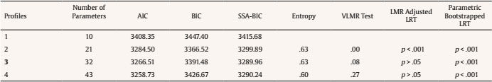 Once all the variables of interest were identified, different fit indices were calculated from one class to four classes to determine the most optimal profile model. These indices were the Akaike information criterion (AIC), the Bayesian information criterion (BIC), the sample size adjusted BIC (SSA-BIC), the entropy, the Vuong-Lo-Mendel-Rubin test (VLMR), the adjusted likelihood ratio test (adjusted LRT), and the parametric bootstrapped LRT. The combination of all these indices determines the most optimal model by considering the significance of the p-values of the VLMR, the adjusted LRT and the parametric bootstrapped LRT, a value as close to 1 for entropy, and small values of AIC, BIC, and SSA-BIC with the largest number of profiles. In turn, the elbow graph also serves to determine the best solution, so it was calculated considering the values extracted from the AIC, BIC, and SSA-BIC indices. The statistical program Mplus (version 8.7) was used to perform all these analyses.