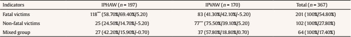Table 3 shows the comparison between the three classes obtained in the LCA and the group of IPHAW and the group of IPVAW. As can be seen, Class 1 (fatal victims, hereinafter) is mostly represented by IPHAW victims (58.70%) while Class 2 (non-fatal victims, hereinafter) is mostly represented by IPVAW victims (75.50%). Class 3 (mixed, hereinafter) appears to be represented by both groups. In addition, to analyze if indeed the obtained classes were predicted by the type of case (IPHAW and IPVAW), the regression analysis showed significant results, with an R2 of .04 (p < .001) and a of -.20, confirming such an association.