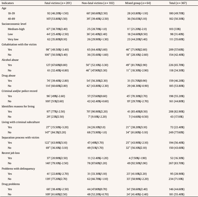 Significant differences (p < .01 and p < .05) are also observed between fatal victims profile and mixed profile in terms of cohabitation, alcohol consumption, criminal history, criminal subculture, separation process with the victim, problems with crime and drugs and, again, socioeconomic level. In this case, it could be interpreted as meaning that it is more likely that when the victim is murdered (fatal victims profile) the aggressor will not live with her or will be in the process of separation, will not have a criminal record or live with a criminal subculture, will not have problems with crime or drugs, and will have a medium-high socioeconomic level.