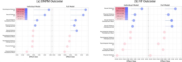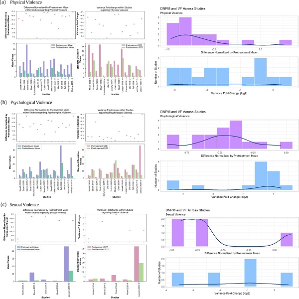 Figure 3 shows how the pre-treatment mean, pre-treatment standard deviation and CV coefficient of violence subtypes of physical, psychological, and sexual violence affect the overall violence regarding the DNPM and VF outcomes. From Figure 3(a) It can be seen that psychological and sexual violence CV have positive effect sizes, which means IPV treatments with study groups where psychological and sexual violence CV are high report that the treatment for overall violence fails. Whereas for study groups where physical violence is high, the IPV treatments are reported to be successful regarding overall violence.