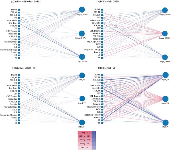 In the figure, the line connecting a treatment to a violence type shows the relationship between the treatment and the corresponding violence type (physical, psychological, and sexual), in terms of the respective outcome variable. The color indicates the significance of the effect size. The darker the color, the greater the significance. There is a positive effect size in blue for DNPM of violence subtypes, which indicates that violence increased, suggesting the variable is indirectly associated with the decline in violence. The violence decrease is indicated by the red color, which is beneficial.