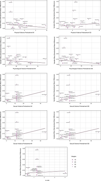 To predict the observed effect sizes of studies, meta-regression models are used with study-level predictors. In meta-regression, an estimate of the effect size of studies that have never been analyzed before is derived from variations in predictor variables and observed effects. Meta-regression models included discrete predictors for the usage of treatment variables and continuous predictors of violence subtypes.