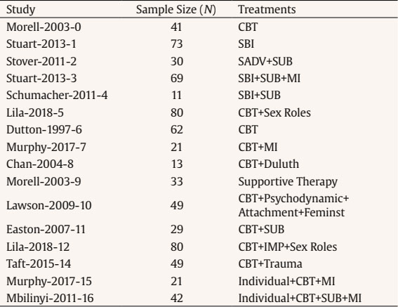A set of studies listed in Table 1 were used previously as part of our meta-analysis on the treatment of IPV perpetrators (Karakurt et al., 2019). The 16 studies were screened between 1997 and 2018 according to inclusion and exclusion criteria. Among these criteria were the use of a treatment, the reporting of pre- and post-test outcomes, and the use of the Conflict Tactics Scale (CTS) (Straus et al., 1996). Karakurt et al. present detailed study criteria in their 2019 article (Karakurt et al., 2019).