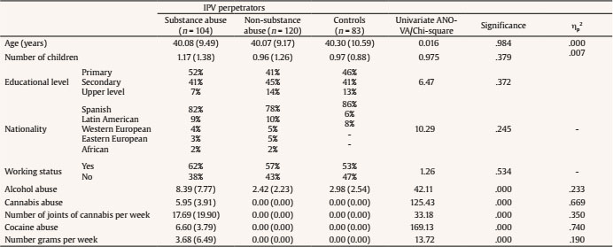 Initially, we checked for differences in demographic variables between groups. As Table 1 shows, there were no differences in any of the variables considered, that is, age, number of children, educational level, nationality, and/or working status. As expected, the groups differ in alcohol, F(2, 306) = 42.11, p < .001, p2 = .233; cannabis, F(2, 306) = 125.43, p < .001, p2 = .669; and cocaine consumption, F(2, 306) = 169.13, p < .001, p2 = .740. In all cases, IPV perpetrators with substance misuse consumed more alcohol (t = 5.97, p < .001 and t = 5.40, p < .001, respectively), cannabis (t = 5.95, p < .001 and t = 5.95, p < .001, respectively), and cocaine (t = 6.60, p < .001 and t = 6.60, p < .001, respectively) than non-substance misuse IPV perpetrators and controls. Additionally, we specified the number of joints as well as the grams of cocaine per week.